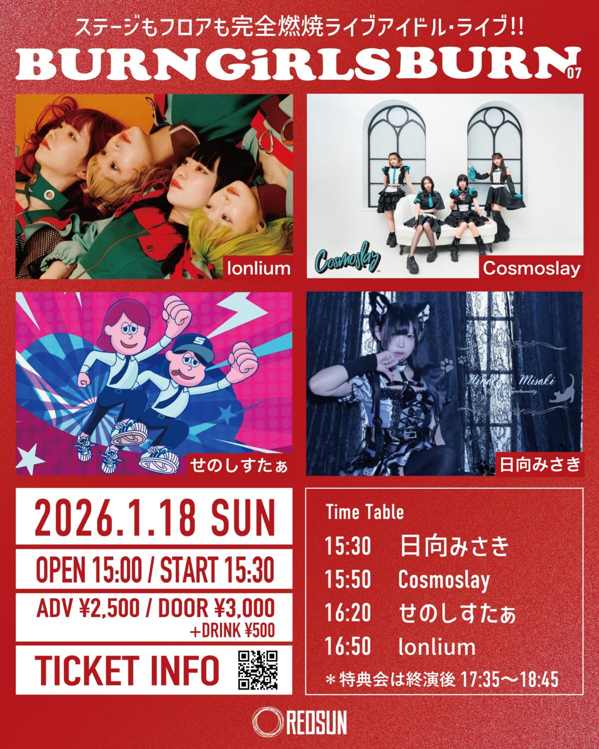 1/18 (Sun.) Open 15:00 / start 15:30 【タイムテーブル】15:00〜 整理番号順入場15:30〜 日向みさき(from 君色+シンクロニシティ)15:50〜 Cosmoslay16:20〜 せのしすたぁ16:50〜 lo……